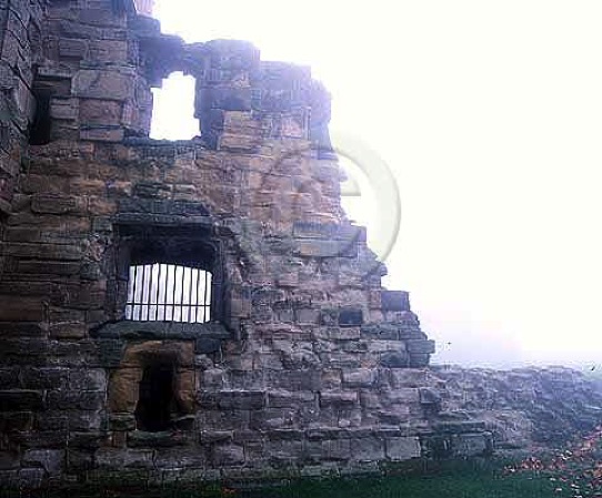 The ruins of possibly the castle kitchens laid bare in the winter mist.