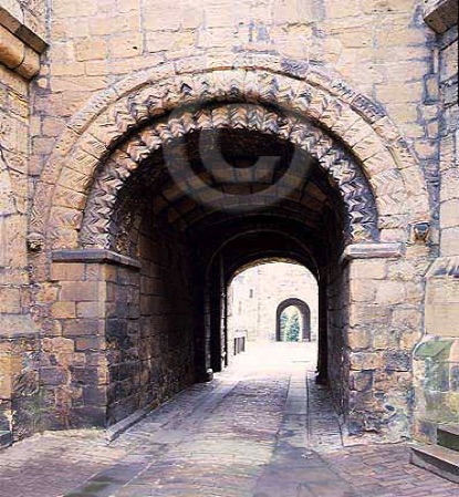 Inner ward arched entrance with the original Norman 'dog-tooth' pattern decorating the arch which terminates on each side with a lion's head.