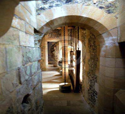 Inside the barbican - winding mechanism for raising and lowering the portcullis.