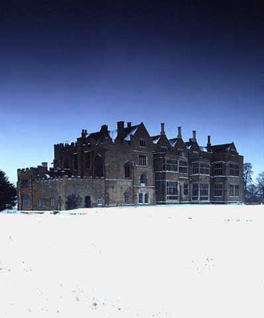 Broughton in winter: Viewed across the snow covered Moat, although it is called a castle, it is largely a 16th century country house with some 14th century remains.