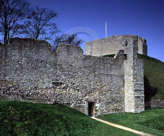 Castle Curtain Wall from the south east showing the Postern (gateway) and the Norman Motte and Shell Keep.