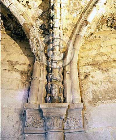 Keep's Chapel ceiling in detail. Norman carvings on the roof bosses and column capitals.