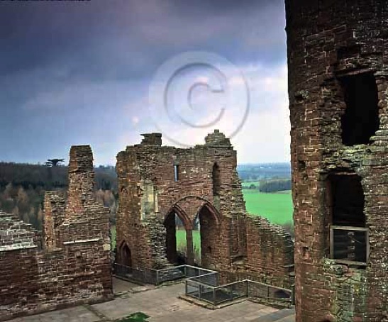 View of part of the Chapel Tower on right and left the Great Hall and Solar.