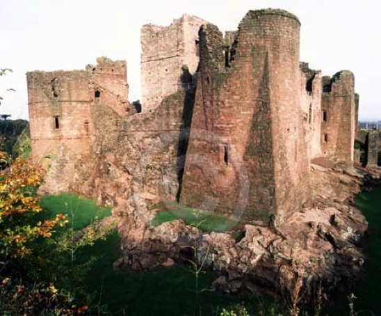 From across the dry Moat, ruined Castle, Curtain wall towers of red sandstone masking