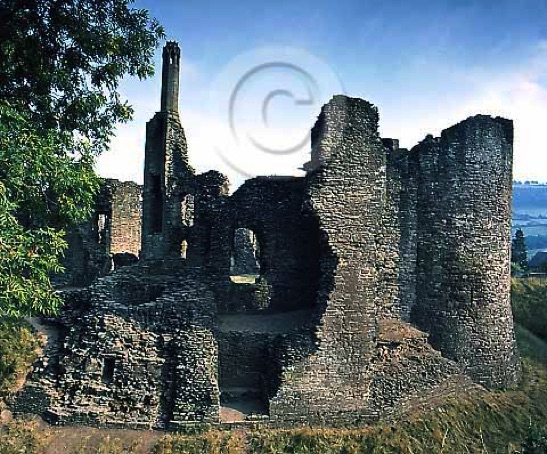 Viewed from the north west across the dry Moat, showing the ruined Great Hall and its 14th century chimney.