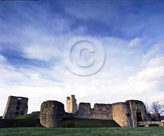 Across the 30ft deep ditch, is the ruined stone towered Curtain Wall. To the far left is the West Tower and in the centre of the picture the Great East Tower with the South Barbican Gatehouse on right.
