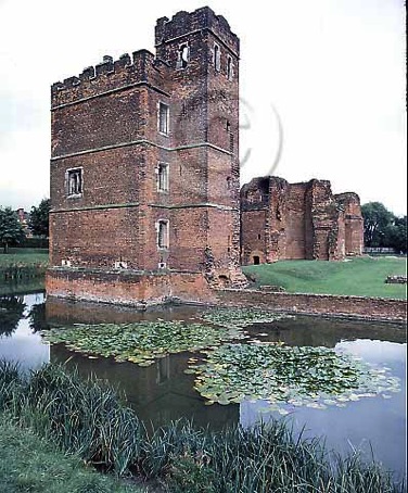 Across the Moat, one of the red brick corner towers and distant Gatehouse.