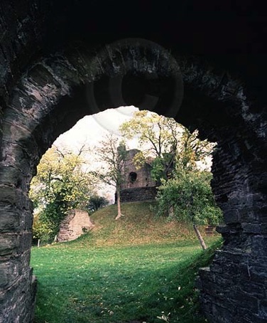 Ruined Castle tower as seen through the archway entrance of the Gatehouse.