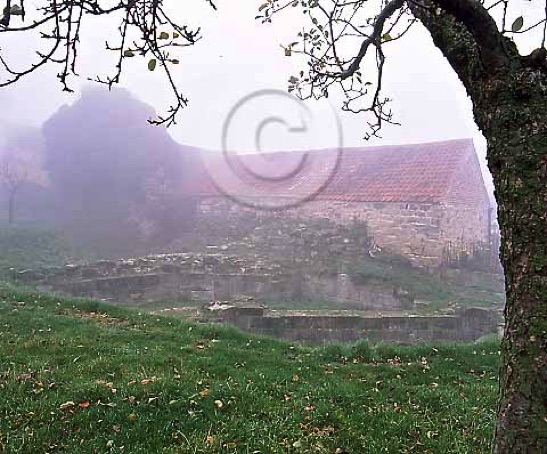 Through the winter mists in front of a modern farmhouse, one can just make out