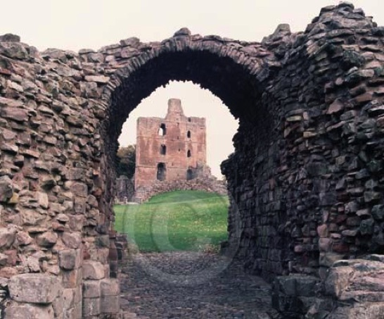 The Norman rectangular Keep built c.1170 as seen through the ruined stone archway