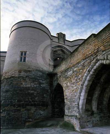Close up of the 13th century stone bridge and one of the Drum Towers of the Fortified Gatehouse.