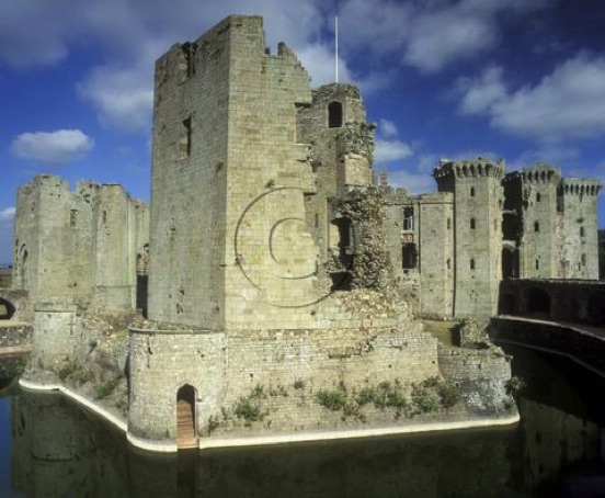 Viewed from the south, showing the 15th century great Towered Keep, Moat and,