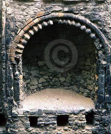 Note the chevron moulding around the arch and the joist holes for the flooring.