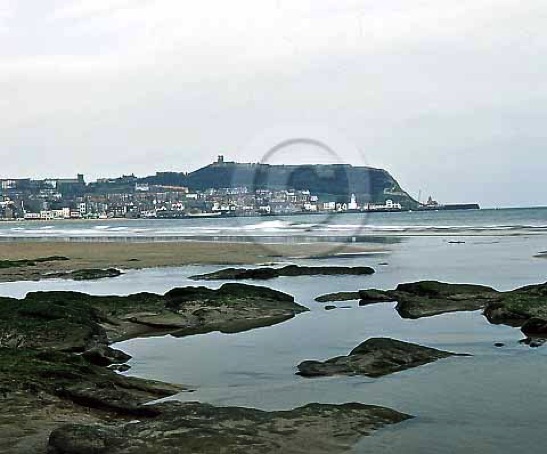 Distant view of the castle atop the rocky headland, from the South Bay.