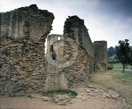 Ruined rectangular four towered Curtain enclosure dated early 13th century.