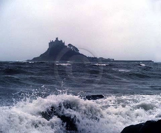 Through the rain a distant view, the Castle on its storm swept Island rock.