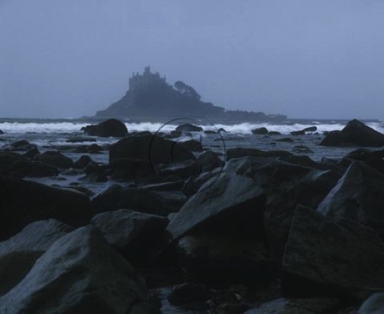 Through the rain a distant view, the Castle on its storm swept Island rock.