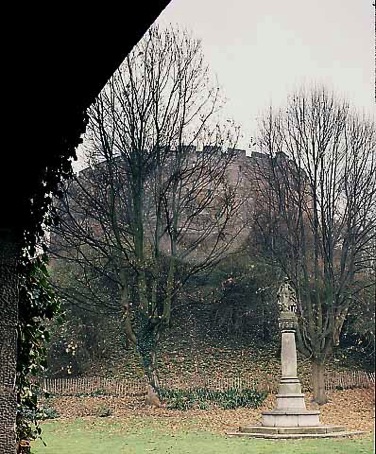 View, through the leafless trees, of the Norman Shell Keep built possibly in the 12th century.