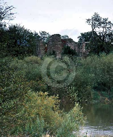 Overgrown remains of a 12th and 14th century Castle surrounded by a wet Moat.