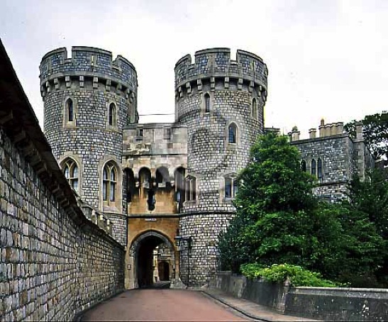 Approach to 'Norman Gate' Gatehouse with flanking cylindrical towers which